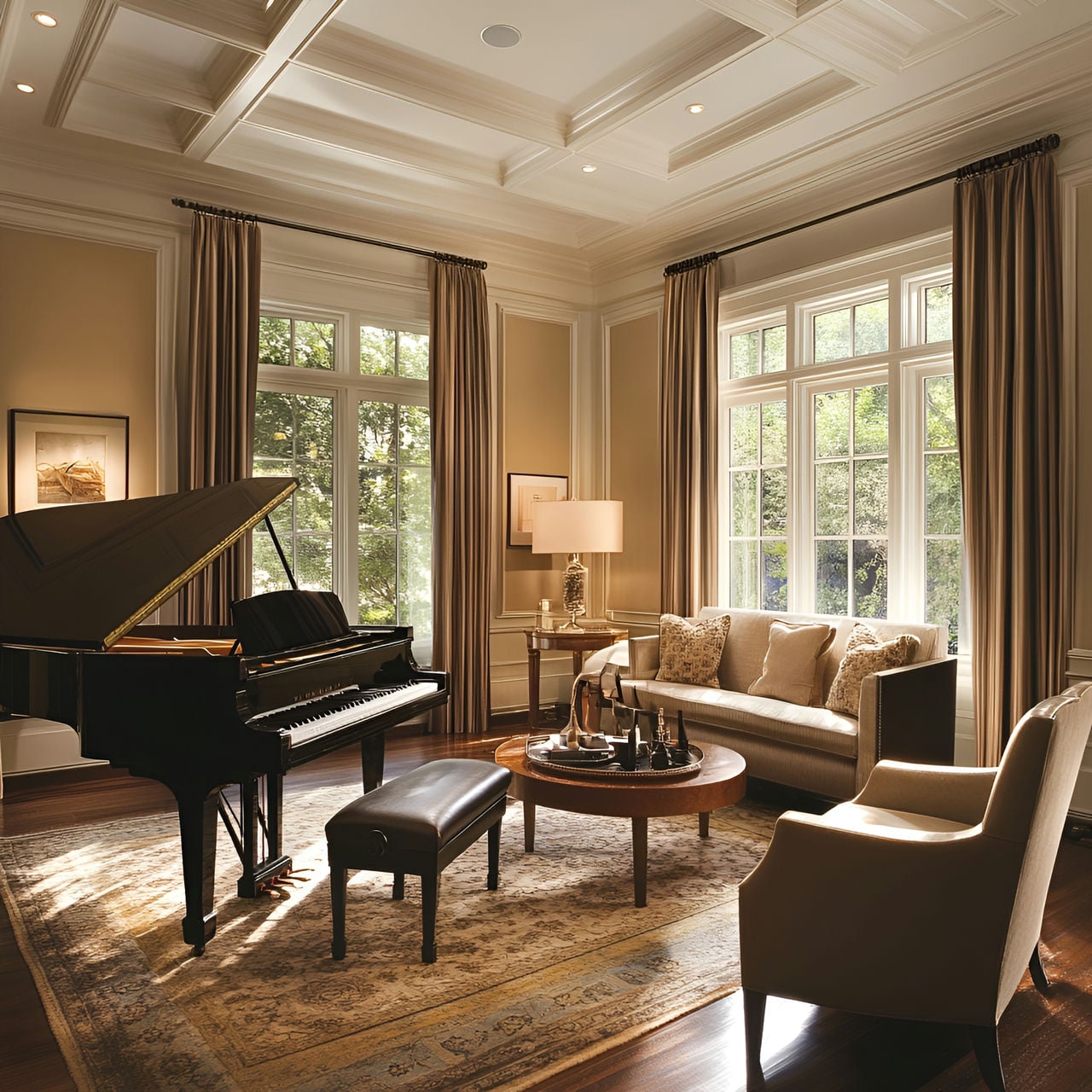 La hauteur sous plafond d’un salon de réception varie généralement de 2,4 mètres (8 pieds) à 3,6 mètres (12 pieds). Dans les maisons anciennes, les plafonds mesurent le plus souvent entre 2,4 mètres (8 pieds) et 3 mètres (10 pieds). Dans les constructions suburbaines plus récentes, la hauteur courante est comprise entre 2,7 mètres (9 pieds) et 3 mètres (10 pieds). Dans les maisons de prestige ou les résidences luxueuses, les salons de réception affichent des plafonds de 3 mètres (10 pieds) à 3,6 mètres (12 pieds), permettant l’installation de grandes fenêtres, de moulures décoratives complexes et de lustres imposants. Le compromis le plus fréquent se situe entre 2,7 mètres (9 pieds) et 3,3 mètres (11 pieds), une hauteur qui offre de belles proportions et une luminosité optimale, tout en conservant une atmosphère conviviale.